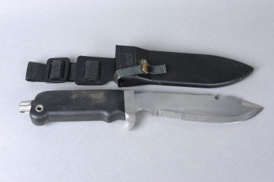 WILKINSON SWORD A SCARCE SURVIVAL KNIFE, NO. 0095 the stainless single-edged blade with saw back, the handle removing to reveal survival kit and compass |