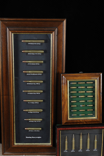 THREE CARTRIDGE DISPLAY BOARDS of modern manufacture, the larger board titled "Hunting Heavyweights", including many Nitro Express calibres; together with two further small boards (3) |