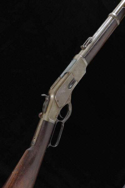 WINCHESTER A .44-40 MODEL 1873 SADDLE RING CARBINE, NO. 457001B 20-inch round barrel with full length magazine tube, folding ladder rear sight, the receiver with loading gate, sliding dust cover and saddle ring, 12 3/4-inch stock with steel butt plate, 7lb. 4oz., nitro proof, worn overall S1 |
