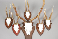 and five pairs of mounted roe deer antlers, all on decorative shields