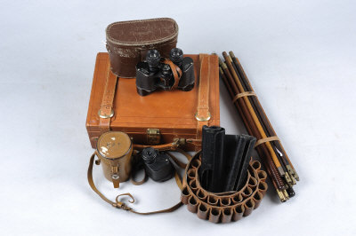 comprising: a Continental leather cartridge magazine, for approximately 150 cases, reproduction Holland & Holland label; four leather hand guards; a cartridge belt; shotgun cleaning rods; a Barr & Stroud monocular, in its leather case; and a pair of binoculars by Lieberman & Gortz, etc