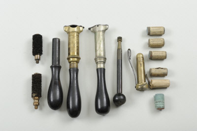 A GROUP OF GUNMAKERS ACCESSORIES comprising: 2 pinfire rolled turnover tools, a further tool and 4 Fort Lodge patent expanding shot cartridges, etc |