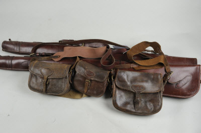 A PAIR OF LEATHER GUN SLIPS AND THREE CARTRIDGE BAGS