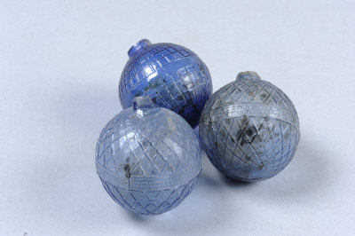 E. JONES TWO GLASS TARGET BALLS the light blue body moulded indistinctly with maker's details around a central band; together with a further target ball, of mid blue colour with moulded box design (3) |