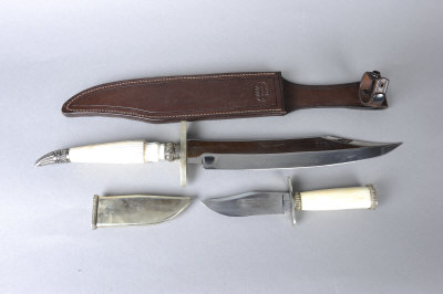 A LARGE BOAR KNIFE WITH HIPPO-TOOTH HANDLE together with a smaller hippo-tooth handle knife, the blade etched Hand Forged by Richard Washer, London (2) |