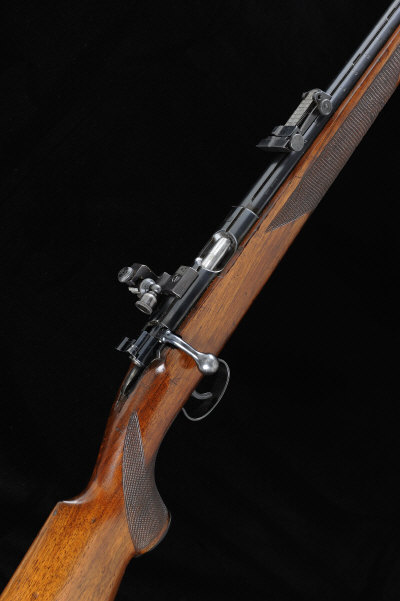 26 3/4-inch barrel with ramp fore sight and adjustable rear sight numbered to the rifle, the receiver with dovetail groove and mounted with a Parker-Hale 16N aperture rear sight, bolt with flag safety, half length stock with pistol grip, 14-inch pull, 8lb. 9oz., German nitro proof