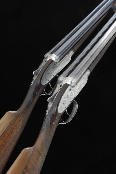 J. PURDEY & SONS A PAIR OF 12-BORE SELF-OPENING SIDELOCK EJECTOR GUNS, NOS. 17304/5 30-inch chopper-lump barrels (No.2 replacement by the maker), with 2 1/2-inch chambers about 1/4, 1/2 and 1/4, 3/4 choke borings respectively, the frames, locks and numbered top levers with fine bouquet and scroll engraving, cocking indicators, 15 1/2-inch well figured replacement stocks, fitted with rubber comb raisers, 7lb., nitro proof, ejectors require regulation, fore-end loop of the No.2 gun detached, in their maker's brassbound oak and leather case S2 The maker confirms that the guns were built in 1901 for A. Whitelaw. The guns were subsequently re-stocked by the maker in 1947.