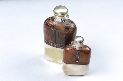 with silver plated cup and mounts; together with a similar flask, of smaller size (2)