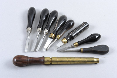 comprising: 8 turnscrews of various patterns; together with a choke measuring tool (9)