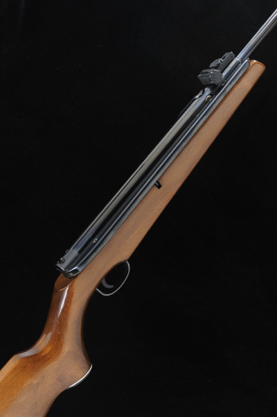 18-inch barrel with ramp fore sight and adjustable rear sight, side lever and loading tap, the half length stock with pistol grip, cheekpiece and rubber recoil pad, 7lb. 6oz.