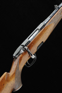 19 1/2-inch barrel with ramp fore sight, receiver with side safety, detachable box magazine, full length stock with pistol grip and cheekpiece, ribbed butt plate, 14-inch pull, 6lb. 8oz., nitro proof; together with a set of scope rings for this model