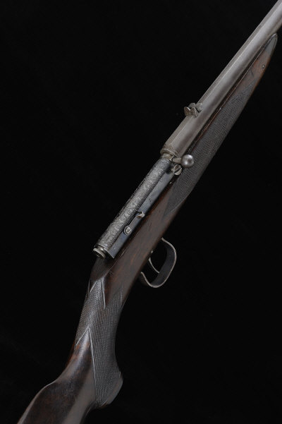 25 1/2-inch barrel with machined top surface, rear sight with folding leaf to 100, the bolt with fine scroll engraving and turn-down handle, the half length well figured stock with pistol grip, 14 1/4-inch pull, 4lb. 12oz., black powder proof