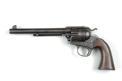COLT - WITHDRAWN A .455 BISLEY FLAT TOP TARGET REVOLVER, NO. 160809 7 1/2-inch barrel impressed with Hertford address, ejector rod, solid frame with loading gate and adjustable rear sight, impressed with two line patent dates and rampant colt motif, two-piece smooth walnut grip, retaining traces of original finish, black powder proof S5 |