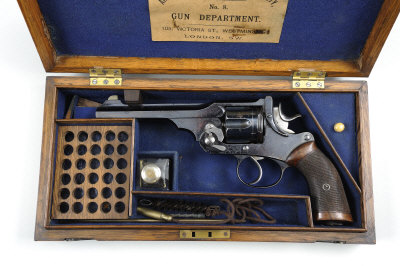 WEBLEY A .455/.476 WG ARMY MODEL REVOLVER, NO. 18747 6-inch barrel, the top surface impressed with the retailer's name 'Army & Navy CSL', frame with stirrup catch and impressed with winged bullet trademark, flared walnut grips and lanyard ring, retaining much original finish overall, black powder proof, in its fitted oak case with oil bottle, etc S5 |