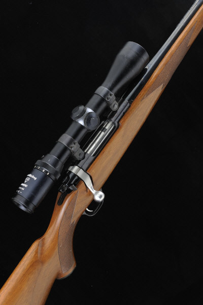 22-inch barrel, the receiver mounted with a Nikko Stirling telescopic sight in maker's mounts, bolt with side safety, magazine with hinged base plate, the half length stock with pistol grip and rubber recoil pad, 13 3/4-inch pull, 8lb. 7oz., nitro proof
