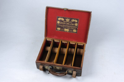 JOSEPH LANG & SON A LEATHER CARTRIDGE MAGAZINE for about 250 cases, with leather straps and oak dividers |