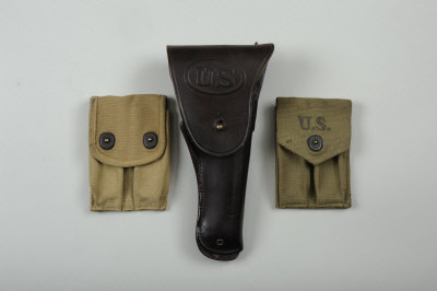 the brown leather flap impressed "US" and with the maker's mark "Hoyt, 1918, JJM", in unissued condition; together with two canvas magazine pouches (3)