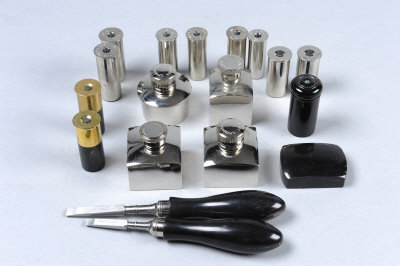 J PURDEY & SONS A GROUP OF GUNMAKERS ACCESSORIES comprising: 4 named oil bottles, a pair of snap caps with horn bodies, 3 further pairs of snap caps, a pair of turnscrews, striker pot and snapping block |