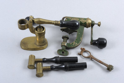 A GROUP OF VINTAGE RELOADING TOOLS comprising: 12-bore capper/de-capper, rolled turnover tools, 2 powder measures, cartridge extractor, scales, etc |