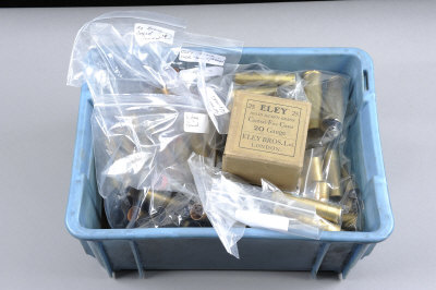 A COLLECTION OF PRIMED BIG BORE SHOTGUN CASES comprising: five part-formed 4-bore cases; twenty-three Eley 8-bore cases; ten Eley 8-bore industrial cases; twenty-four Eley 10-bore cases; twenty-seven Eley 10-bore brass cases; together with a selection of 12-bore brass cases; and a box of twenty-five 20-bore cases (Qty) |
