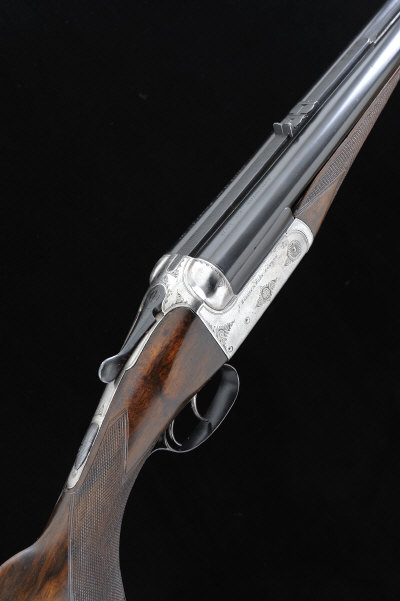 23-inch barrels with ramp fore sight, file-cut short raised rib with folding leaf sights, the frame and top lever with border and scroll engraving, 14 3/4-inch figured stock with pistol grip and including rubber recoil pad, 10lb. 14oz., nitro proof, canvas case
