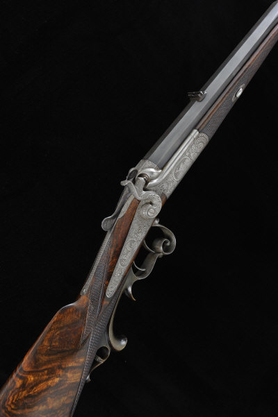 24-inch round to octagonal barrel with ramp fore sight, rear sight with folding leaves, the rounded frame, hammer, rebounding back lock and top lever with fine foliate scroll engraving surrounding woodland scenes of dog and deer, the left side of the breech with dummy lock and percussion fence, double set triggers, 13 3/4-inch highly figured stock with pistol grip and steel butt plate, the right side with patchbox engraved with further woodland scenes, 8lb. 2oz., German nitro proof