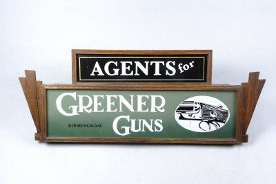 W. W. GREENER AN UNUSUAL ILLUMINATED SIGN, "AGENTS FOR GREENER GUNS" the oak and glass display item in Art Deco style, to fit over an existing light source, 36-inches wide |