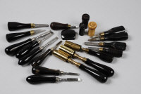 A GROUP OF GUNMAKERS GUN CASE ACCESSORIES comprising: 3 chamber brushes, 13 turnscrews of various sizes, 3 striker pots and a horn snapping block |
