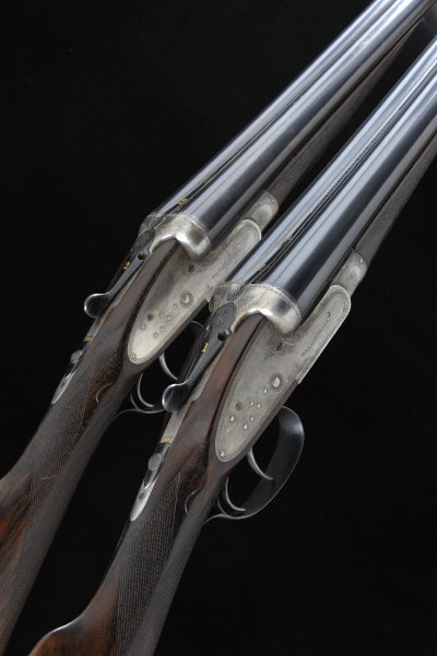 WILLIAM EVANS A PAIR OF 12-BORE SIDELOCK EJECTOR GUNS, NOS. 17088/9 26 1/2-inch barrels with 2 1/2-inch chambers, about 1/4 and 1/2 choke borings, doll's head extensions, the frames, locks and gold numbered top levers with border engraving and retaining some original hardening colour, 15-inch figured stock, 6lb. 6oz., nitro proof, bores pitted, in their maker's oak and leather case S2 |