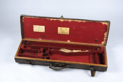 JAMES PURDEY & SONS A BRASSBOUND OAK AND LEATHER GUN CASE with compartment for 28-inch barrels, originally for a .500 rifle, the lid with charge card for rifle, no. 12992 |