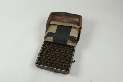 MCARTHUR & PRAIN A LEATHER GANNOCHY RAPID LOADER the removable lid revealing rain cover and sprung metal cartridge clips for 100 cases |