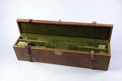 A DOUBLE LEATHER MOTOR CASE suitable for a pair of over and under guns, with compartments for 30-inch barrels |