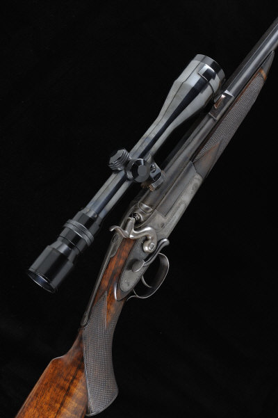 MANTON & CO. A 7X57 SINGLE BARREL HAMMER EJECTOR RIFLE, NO. 06656, CONVERTED FROM .303 27-inch lined barrel with machined rib and raised fore sight, mounted with a Kahles Helier Super telescopic sight in quick detachable claw mounts, the rounded frame, rebounding bar lock, hammer and side lever with scroll engraving and retaining traces of original hardening colour, 14 1/4-inch figured stock with pistol grip, steel butt plate and butt trap, 8lb. 12oz., nitro re-proof S1 |