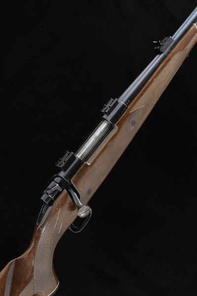 23 1/2-inch barrel with ramp fore sight and adjustable rear sight, the receiver with scope mounting blocks, bolt with side safety, magazine with hinged base plate, 13 1/2-inch figured stock with pistol grip and cheekpiece and rubber recoil pad, 7lb. 15oz., nitro proof