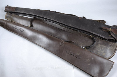 A PAIR OF LEATHER FULL LENGTH GUN SLIPS with fleece lining and straps, 51-inch overall length; together with a further leather gun slip (3) |