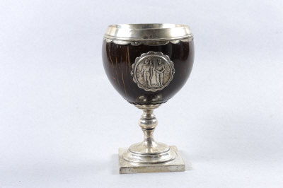 A SILVER-MOUNTED COCONUT N.R.A. PRIZE CUP the silver mounted cup with N.R.A. emblem, 6-inches high, repaired, with hallmarks for Birmingham 1909 |
