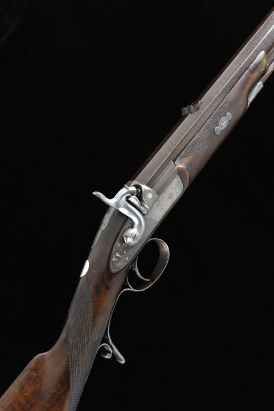 30-inch octagonal damascus-twist barrel with full-length ramrod, the top surface with folding leaf sight, platinum breech plug, plain bolted lock and hammer with border engraving, half length stock with steel butt plate, 14 1/2-inch pull, sling eyes, 9lb. 12oz., black powder proof