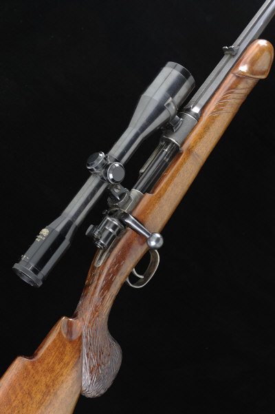 A GERMAN 7.92MM BOLT-ACTION SPORTING RIFLE, NO. 2679 24 1/2-inch octagonal to round barrel with matted top surface, the receiver mounted with a Hensoldt 6x42 telescopic sight in quick detachable mounts, bolt with side safety, the half length replacement stock carved in a phallic manner, 15-inch pull, 9lb., German nitro proof S1 |