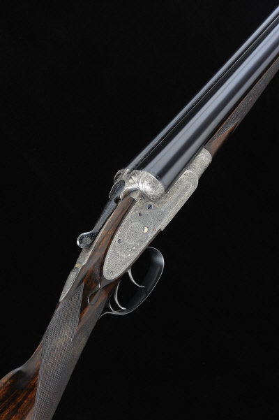 CLABURGH & JOHNSTONE A 12-BORE SIDELOCK EJECTOR GUN 28-inch replacement barrels by the maker, with 2 1/2-inch chambers, about 1/2 and 3/4 choke borings, top extension, the frame, locks and top lever with fine bouquet and scroll engraving and retaining traces of original hardening colour, 16-inch well figured stock including 2-inch extension, 6lb. 9oz., nitro proof S2 |