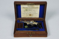 SMITH & WESSON A .32 DOUBLE ACTION FOURTH MODEL REVOLVER, NO. 202053 3-inch barrel with patent dates to 1889, retaining much of its nickel plated finish overall, black powder proof, in its burr walnut fitted case with Westley Richards retailer's label