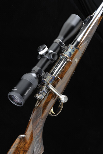 23 1/2-inch quick detachable barrel with ramp fore sight, the short raised rib with folding leaf sight, the maker's name signed in gold, the square bridge receiver mounted with a Swarovski Z6 2.5-15x44 telescopic sight, on quick detachable swing mounts, the bolt with side safety, magazine with hinged base plate, recoil stud, retaining virtually all of its original colour hardened finish, without outline detail inlaid in gold, set trigger, 14 1/2-inch highly figured stock with pistol grip, cheekpiece and leather covered recoil pad, grip with cap, sling eyes, 10lb. 15oz., German nitro proof, in its maker's light case, together with a copy of a magazine article reviewing this rifle
