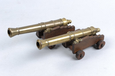 A PAIR OF 12-BORE BREECH-LOADING BLACK POWDER BLANK CANNONS 9-inch brass barrels with screw breeches, mounted on their miniature carriages, recent nitro proof (2) S1 |