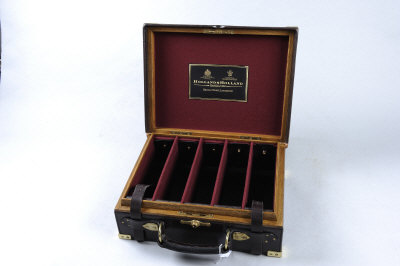 HOLLAND & HOLLAND A BRASSBOUND OAK AND LEATHER CARTRIDGE MAGAZINE for about 400 cases, with leather straps and dividers and appearing very little used |