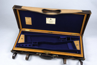J. PURDEY & SONS A BRASSBOUND OAK AND LEATHER DOUBLE GUN CASE with charge card for a pair of 16-bore guns, nos. 21307/8, with compartments for 29-inch barrels, the case has been re-fitted, re-lined and re-covered and re-furbished to the best London standard, including new canvas and leather outer cover |