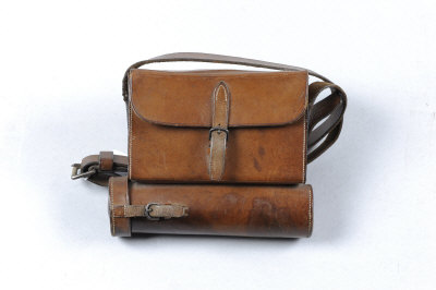the leather case containing sandwich box and conical glass flask