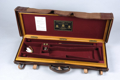 fitted for a 20-bore over and under gun, with two pairs of 27-inch barrels (compartments will take 29-inch barrels), charge card for gun no. 28529, in its canvas and leather outer cover