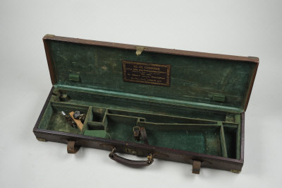 the green velvet-lined interior with compartment for 28-inch barrels