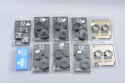 SAKO SIX PAIRS OF OPTILOCK SCOPE MOUNT RINGS in their maker's packets; together with a pair of Optilock scope mount bases; two pairs of Leupold Sako low ring mounts; and another pair of mounts (Qty) |