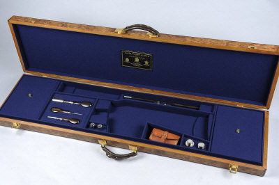 fitted for an over and under gun with 28-inch barrels, James Purdey & Sons label, fitted with the very best quality tools by Mike Marsh, the oak framed burr walnut case in its custom leather cover, interior dimension 44 by 9 1/2-inches