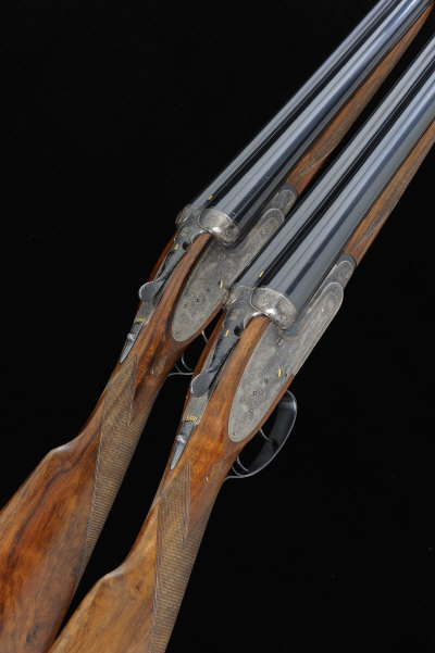 P. ARRIZABALAGA A PAIR OF 12-BORE SELF-OPENING SIDELOCK EJECTOR GUNS, NOS. 031-99 AND 032-99 27 1/2-inch chopper-lump barrels with 2 3/4-inch chambers, about 1/4 and 1/2 choke borings, the frames, locks and gold numbered top levers with fine bouquet and scroll engraving and retaining virtually all of their original hardening colour, gold line cocking indicators, articulated front triggers, rolled edge trigger guards, 15-inch highly figured stocks, 6lb. 10oz., nitro proof, lightweight plastic case S2 The guns were built in 1999 and were finished to a very high standard. |